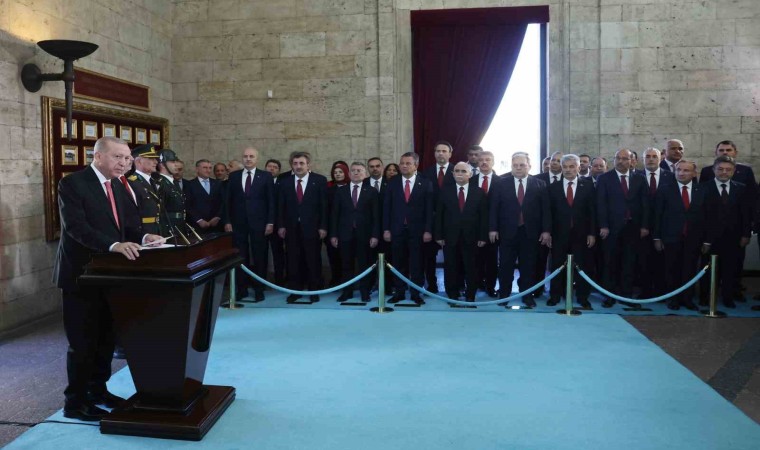 Cumhurbaşkanı Erdoğan’ın Aslanlı Yol’un başındaki yerini almasının ardından başlayan törende, Türkiye Büyük Millet Meclisi Başkanı Numan Kurtulmuş, Cumhurbaşkanı Yardımcısı Cevdet Yılmaz, CHP Genel Başkanı Özgür Özel, MHP Genel Başkanı Devlet Bahçeli, Cumhurbaşkanlığı Kabinesi üyeleri, Yüksek Yargı üyeleri, Genelkurmay Başkanı Orgeneral Metin Gürak ve kuvvet komutanları da Aslanlı Yol’dan geçerek mozoleye çıktı.
