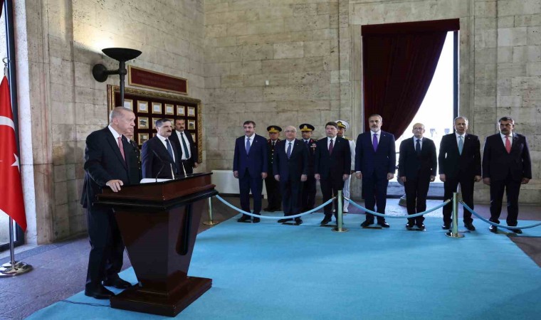 Cumhurbaşkanı Erdoğan’ın ay yıldız motifli çelengi Atatürk’ün mozolesine bırakmasının ardından saygı duruşunda bulunuldu, İstiklal Marşı okundu. Cumhurbaşkanı Erdoğan başkanlığındaki heyet, mozoleye çıkan merdivenin önünde fotoğraf çektirdikten sonra Misak-ı Millî Kulesi’ne geçti. Burada Anıtkabir Özel Defteri’ni imzalayan Cumhurbaşkanı Erdoğan, deftere şunları yazdı: