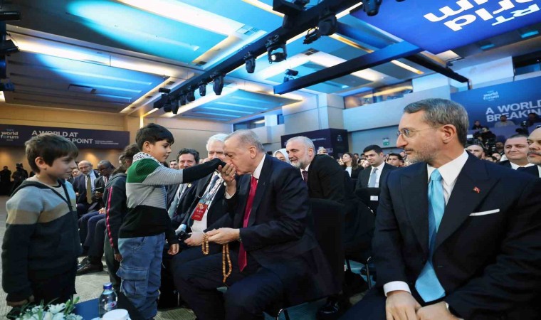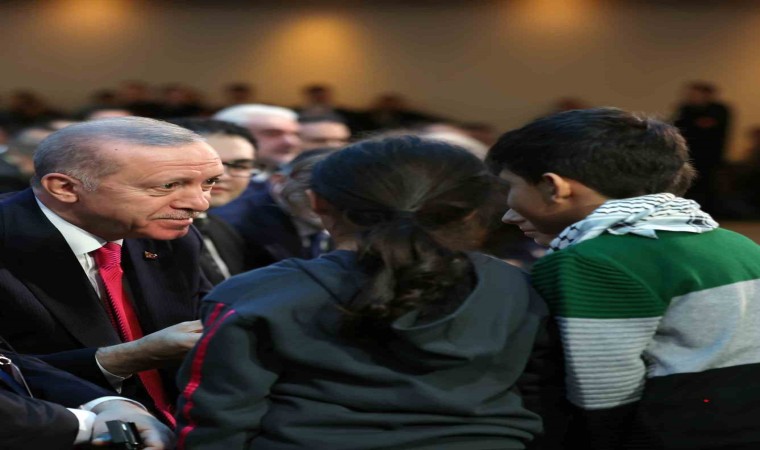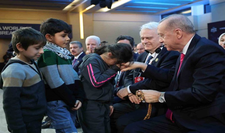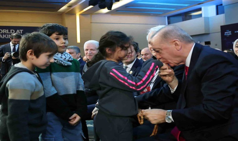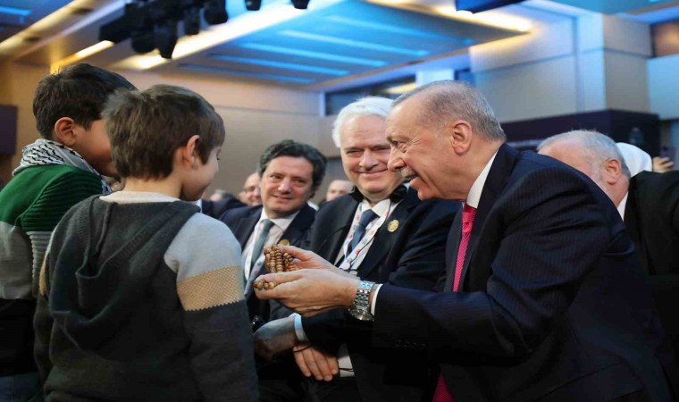 Öte yandan Cumhurbaşkanı Erdoğan’a konuşmasından önce Kudüs’ten gelen Filistinli çocuklar tarafından zeytin ağacından yapılmış tespih hediye edildi. Cumhurbaşkanı Erdoğan’ın konuşması sırasında tesbihi kürsünün üzerinde bulundurduğu görüldü.