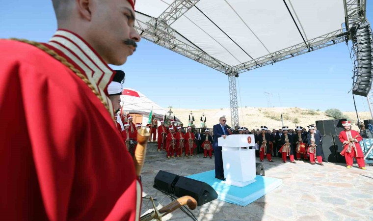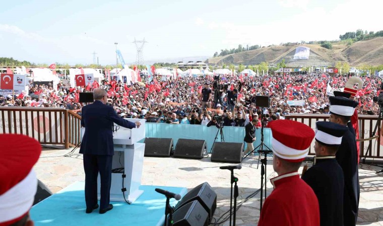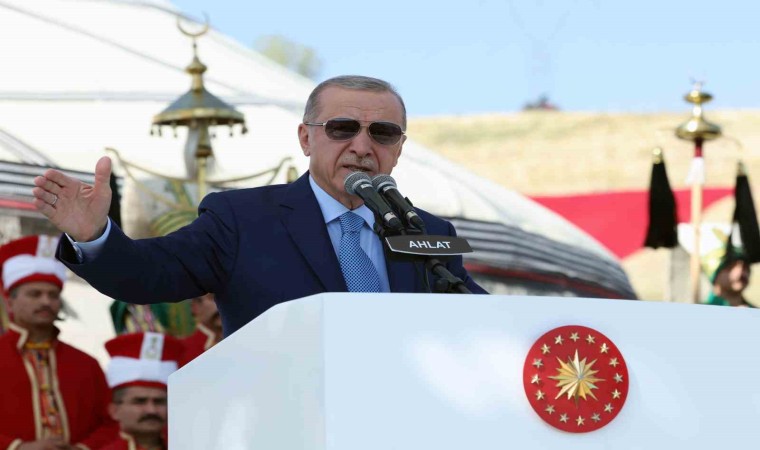 Ahlat’ın, Anadolu’da okun ilk düştüğü yerlerden, ocağın kurulduğu ilk yurtlardan olduğunu ifade eden Erdoğan, "Ecdadın konakladığı, nefeslendiği, zamanını doğru okuduğu Ahlat bin yıl öncesinden bugüne kurulan bir iman, kültür ve medeniyet köprüsüdür. Burası Anadolu’daki tarihimizin yapılmasında ve yazılmasında daima pergelin sabit noktası olmuş konumuyla ve kimliğiyle iftihar duyduğumuz bir şehirdir. Ahlat’ta bin yıldır atan nabız milletimizin ve devletimizin nabzıdır. Bin yıldır bu topraklarda tüten ocak devletimizin ve milletimizin ocağıdır. Bin yıldır bu toprakların sanat eserine dönüştürerek taşa toprağa işlediği hafıza, devletimizin ve milletimizin hafızasıdır. Ahlat’ın kıymetini bilmek, Anadolu’daki varlığımızın, medeniyetimizin kültürümüzün bizi bir kimlik sahibi kılan değerlerin değerini bilmektir. Her biri dünya yazı sanatının taş işçiliğinin mezar mimarisinin eseri olan Ahlat eserleri hüdayinabit olarak yerden bitmemiş, bizim daha önceki medeniyet birikimimizin semeresi olarak tezahür etmiştir. Ahlat’ın sanat eserleri mana itibarıyla geçmişimizi ve geleceğimizi temsil eden abidelerdir. Bunların kıymetini anlamak bizim olduğu kadar gelecek nesillerin de kimliklerinin şerefli bir nişanesi olacaktır. Yahya Kemal’in dediği gibi ’Türkiye sadece mevcut nüfusundan ibaret değildir.’ Türkiye’nin nüfus varlığı sayılamayacak, ölçülemeyecek, istatistikle ifade edilemeyecek kadar büyüktür, geniştir, güçlüdür. Bünyesinde milletimizin başka coğrafyalardaki hayatlarının remizlerini ve manalarını da mücessem hale getiren Ahlat Malazgirt’te birlikte muazzam bir coğrafyada fetih ve medeniyet rüzgarı estirmiştir. Toynaklarından kıvılcımdan çıkararak batıya doğru koşan atlar, binlerce yıllık değerlerimizi doğudan batıya taşıyan rüzgar kanatlı atlardır. Ay yıldızlı bayrağımızın dalgalandıran asıl rüzgar o rüzgardır. Ahlat, fatihler doğuran, başkentler doğuran, fiziki varlığından daha büyük görevler, manalar ihtiva eden şehirler anası bir şehirdir. 8 bin 200 ecdat mezarıyla Ahlat bize kim olduğumuzu nereden gelip nereye gittiğimizi de hatırlatırız. Göreve geldiğimiz günden bu yana Ahlat’ı yeniden bir başkent gibi ihya etmeyi vazife olarak gördük. Hep bu şuurla hareket ettik" dedi.