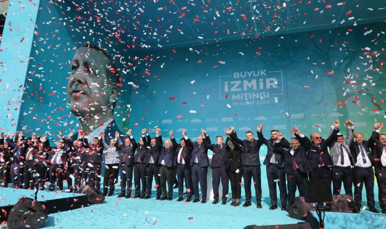 Mitingde İzmir’e yapılan hizmetlere dair video gösterimi yapıldı. Video gösteriminin ardından konuşmalarına devam eden Erdoğan, “31 Mart’tan sonra bunlara yerel yönetimlerle iş birliği içinde çok daha fazlasını ilave edeceğiz. İzmir’in önündeki engelleri dağ gibi sağlam adayımız Hamza kardeşimle birlikte birer birer kaldıracağız. Cumhurbaşkanlığıyla ve bakanlıklarımızla belediyelerimizin sizlere getireceği her yatırımın, her eserin, her hizmetin destekçisi olacağız. Bu duygularla büyükşehir ve ilçe belediye başkan adaylarımızı ben sizlere emanet ediyorum. Onları desteklemeye var mıyız? İnşallah siz bana müjde, ben de dünyaya müjdeyi vereceğim” diyerek sözlerini tamamladı.