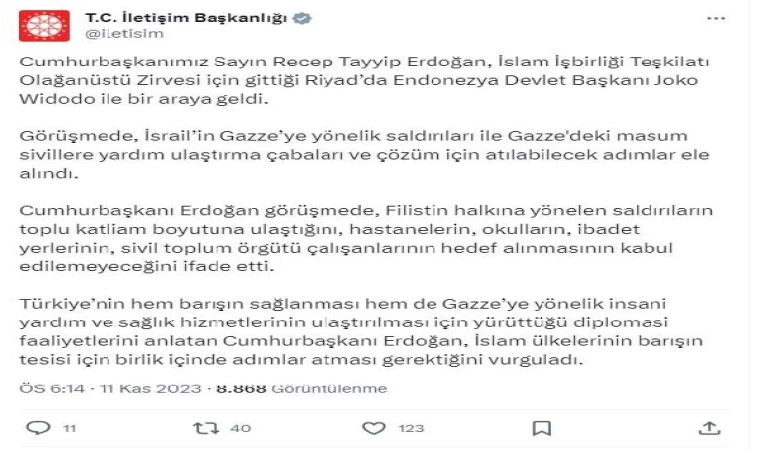 İletişim Başkanlığı'ndan yapılan açıklamaya göre; Cumhurbaşkanı Recep Tayyip Erdoğan'ın, İslam İşbirliği Teşkilatı Olağanüstü Zirvesi için gittiği Riyad’da Endonezya Devlet Başkanı Joko Widodo ile bir araya geldi. Görüşmede, İsrail’in Gazze’ye yönelik saldırıları ile Gazze'deki masum sivillere yardım ulaştırma çabaları ve çözüm için atılabilecek adımlar ele alındı. Cumhurbaşkanı Erdoğan görüşmede, Filistin halkına yönelen saldırıların toplu katliam boyutuna ulaştığını, hastanelerin, okulların, ibadet yerlerinin, sivil toplum örgütü çalışanlarının hedef alınmasının kabul edilemeyeceğini ifade etti. Türkiye’nin hem barışın sağlanması hem de Gazze’ye yönelik insani yardım ve sağlık hizmetlerinin ulaştırılması için yürüttüğü diplomasi faaliyetlerini anlatan Cumhurbaşkanı Erdoğan, İslam ülkelerinin barışın tesisi için birlik içinde adımlar atması gerektiğini vurguladı. (DHA)