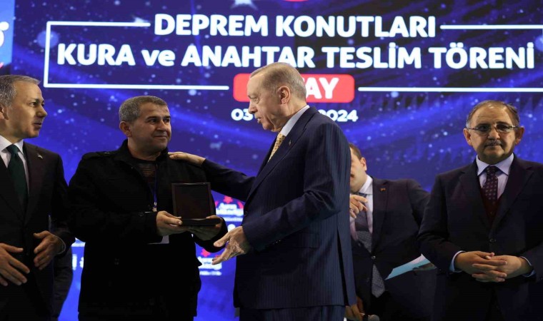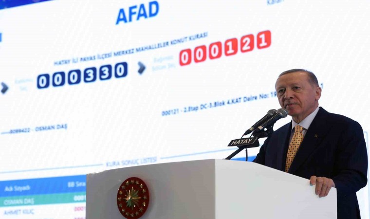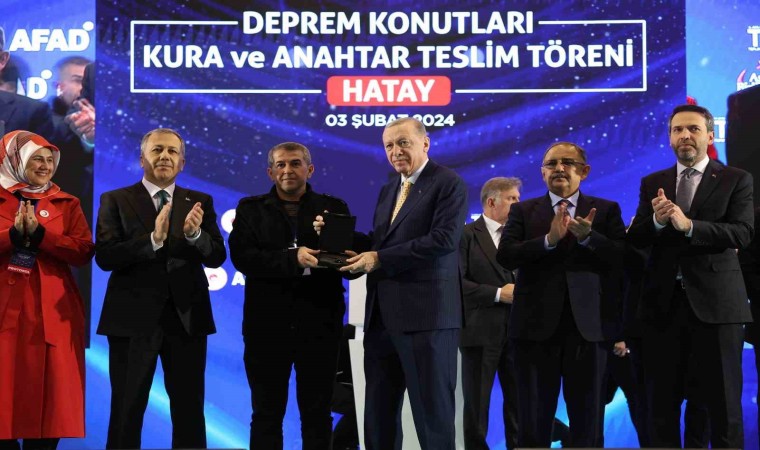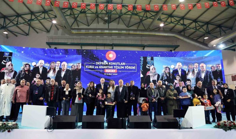 Cumhurbaşkanı Recep Tayyip Erdoğan, Kahramanmaraş merkezli depremlerden etkilenen Hatay’da depremzedeler için yapılan konutların ilk kura çekim ve anahtar teslim törenine katıldı. Mustafa Kemal Üniversitesi Kapalı Spor Salonu’nda gerçekleşen törende Cumhurbaşkanı Erdoğan, yapımı tamamlanan 7 bin 275 konutu hak sahipleriyle buluşturdu.
