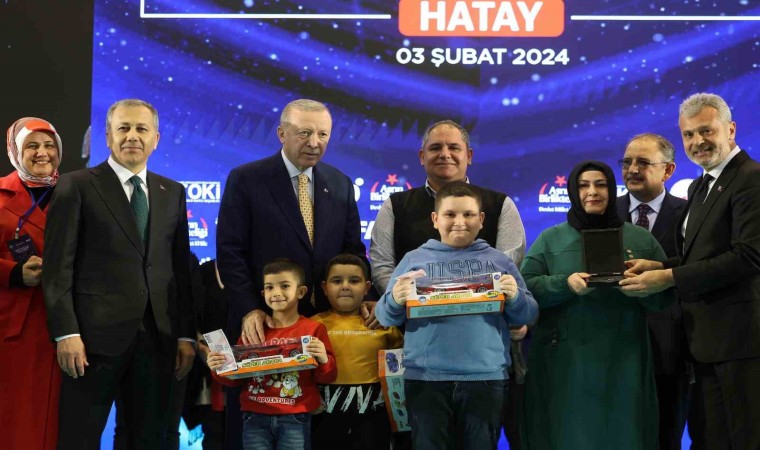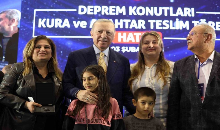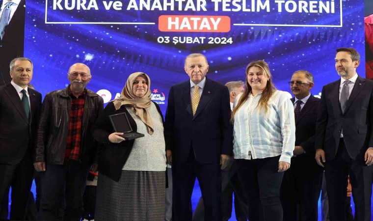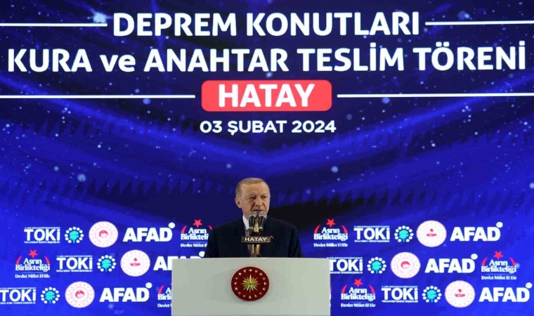 Cumhurbaşkanı Erdoğan, Hatay’ın can kaybı ve yıkılan bina sayısı bakımından depremden en büyük zararı gören şehir olduğunu kaydederek, "Depremden sonraki ikinci gün Hatay’a geldiğimizde karşılaştığımız tabloyu asla unutmayacağız. Hatay’ın yaşadığı yıkım gerçekten çok büyüktü. Büyük felaketin ardından Hatay’ın halini görüp gözleri yaşarmayanın kalbi kurumuş demektir. Önceliğimizi arama kurtarma faaliyetlerine, acil ihtiyaçların karşılanmasına verdik. Hatay’da dağıtılan çadır sayısı 286 bini, konteyner sayısı 57 bini bulurken 38 bin kişiyi de yurtlarda, kamu tesislerinde konuk ettik. 589 konut, 15 bin 589 iş yeri, toplamda 150 bine yakın hak sahibi belirledik. Deprem bölgesi genelindeki hak sahibi ise 390 bin olarak netleşti. Bugün de 7 bin 275 hak sahibinin konutunun anahtarını teslim ediyoruz. Yeni yuvalarının hayırlı, uğurlu ve bereketli olmasını diliyorum" şeklinde konuştu.