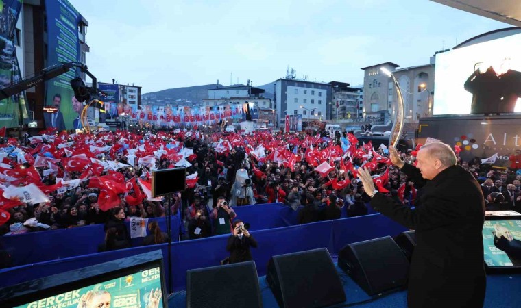 Cumhurbaşkanı Erdoğan, akşam saatlerinde geldiği Yüksekova Havalimanından helikopterle Hakkari il merkezine geçti. Partisi tarafından düzenlenen mitinge katılan Erdoğan, Hakkari’yi özlediğini Hakkarili kardeşlerinin de kendisini özlediğini belirterek, “Van’dan sizlere selam getirdim. Gönüllerimizi bir kez daha buluşturan rabbime hamdolsun. Hakkari’ye gelmeden önce Van’ın misafiri olduk. Maşallah orada da bambaşka bir coşku vardı. Sizlere Vanlı kardeşlerimin o muhabbetini iletiyorum. Doğu batı, kuzey güney demeden ülkemizin dört bir köşesini, 81 vilayetimizin her köşesini dolaşıyoruz. Alevi, Sünni ayrımı yapmadan samimiyetle bağrımıza bastırıyoruz. Bir zamanlar milletimize mağduriyetler yaşatan, kendilerini devletin sahibi gören bir avuç seçkin azınlık dışında çoğumuz ötekileştirildik. Haksızlığa ve hukuksuzluğu maruz bırakıldık. Gezi olaylarında, 17-25 Aralık darbe girişimine, hendek teröründen, 15 Temmuz ihanetine kadar nice badireyi aşarak bugünlere geldik. Ellerinin altındaki tüm piyonları üzerimize saldılar. Eminim sizler de gayet iyi hatırlıyorsunuz. Attığımız her adım ya CHP tarafından engellendi ya da istismar zeminini kaybetmekten korkan bölücü örgüt tarafından sabote edildi. CHP ve ortakları sokaklarımızı karıştırarak ve kışkırtarak yasakların geri gelmesine çalıştılar. Böylece örgüt ise yaşlı, kadın, genç, polis, asker demeden vatan evlatlarını kalleşçe katlederek, aynı amaca hizmet etti. Her ikisi de Türkiye’de huzuru, güvenliği, kardeşliği ve demokrasinin hakim olmasını istemediler. Her ikisi de bu milletin terör belasından yakasını kurtarmasını hiçbir zaman istemediler. Hakkarili kardeşlerimin de bunu gördüğüne inanıyorum. Sizlerden 31 Mart’ta iradenizi kendilerinin tapulu mülkü görenlere esaslı bir ders vermenizi bekliyorum. Buna hazır mıyız?” dedi