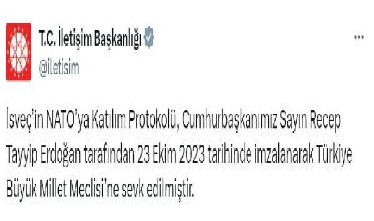 Cumhurbaşkanlığı İletişim Başkanlığı’ndan yapılan açıklamada, "İsveç’in NATO’ya katılım protokolü, Cumhurbaşkanımız Sayın Recep Tayyip Erdoğan tarafından 23 Ekim 2023 tarihinde imzalanarak Türkiye Büyük Millet Meclisi’ne sevk edilmiştir" denildi. (DHA)