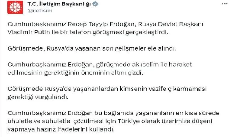 Cumhurbaşkanı Recep Tayyip Erdoğan, Rusya Devlet Başkanı Vladimir Putin ile gerçekleştirdiği telefon görüşmesinde, Rusya'da meydana gelen son olayları ele aldı. İletişim Başkanlığı tarafından yapılan açıklamada, görüşmede her iki liderin de aklıselimle hareket edilmesi gerektiğini vurguladığı ve Rusya'daki gelişmelerin kimseye fayda sağlamayacağını belirttiği ifade edildi. Ayrıca, Cumhurbaşkanı Erdoğan'ın "Yaşanan sorunların en kısa sürede sağduyu ve diplomasiyle çözülmesi için Türkiye olarak üzerimize düşeni yapmaya hazırız" dediği aktarıldı.