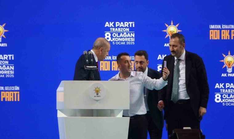 “Trabzon büyük şehir doyamadım tadına. Uzaktan sevmek olmaz, gel yakına yakına” cümleleri ile konuşmasına başlayan Cumhurbaşkanı Recep Tayyip Erdoğan, “Özü bir, sözü bir, gönlü bir Trabzon’da bizi tekrar buluşturan Rabbime hamdolsun” diyerek sürdürdü. Erdoğan’ın konuşması sırasında kürsüye çıkan bir partili kendisi ile öz çekim yaparken, ardından görevliler tarafından indirildi.