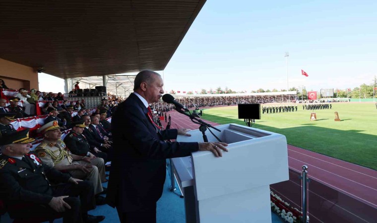 Konuşmasında İstiklal Marşı’ndan bazı satırlara yer veren Erdoğan, “Ne diyor şair? Şüheda fışkıracak toprağı sıksan şüheda. Canı cananı bütün varımı alsın da Hüda, etmesin tek vatanımdan beni dünyada cüda. Sizlere güveniyorum. Rabb’im yolunuzu, bahtınızı açık etsin diyorum. Yarının kahramanları olarak gördüğüm siz kıymetli evlatlarımıza merhum Osman Yüksel Serdengeçti’nin şu mısralarıyla veda etmek istiyorum. ’Kaya gibi dik başın bulutlarla yarışsın. Dalga dalga saçların rüzgarlarla karışsın. Adını nakşedelim. Eski kadim surlara sesini haykıralım asırdan asırlara, ufukları kaplasın bayraklarımız. Al al. Göklere zaferlerimizi çizsin. Vahşi bir kartal. Kahramanlar büyüsün masalda dev misali. Eğilsin. Öksüz gökler canım nazlı hilali. Selam dursun karşısında bütün şerefler şanlar. Namını tebcil etsin, yıldızlar Kehkeşanlar.’ Türkiye Cumhurbaşkanı ve Türk Silahlı Kuvvetlerinin başkomutanı olarak her birinizi kalpten tebrik ediyor, tek tek alınlarınızdan öpüyor, yeni görev yerlerinizde Mevla’dan başarılar diliyorum. Birincilikle mezun olan teğmenlerimizi ayrıca kutluyorum” diye konuştu.