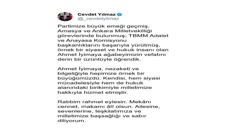 Cumhurbaşkanı Yardımcısı Cevdet Yılmaz ise “Partimize büyük emeği geçmiş, Amasya ve Ankara Milletvekilliği görevlerinde bulunmuş; TBMM Adalet ve Anayasa Komisyonu başkanlıklarını başarıyla yürütmüş, örnek bir siyaset ve hukuk insanı olan Ahmet İyimaya ağabeyimizin vefatını derin bir üzüntüyle öğrendik. Ahmet İyimaya, nezaketi ve bilgeliğiyle hepimize örnek bir büyüğümüzdü. Kendisi, hem siyasi mücadelesiyle hem de hukuk alanındaki birikimiyle milletimize hakkıyla hizmet etmiştir. Rabbim rahmet eylesin. Mekanı cennet, makamı ali olsun. Ailesine, sevenlerine, teşkilatımıza ve milletimize başsağlığı ve sabır diliyorum” ifadelerini kullandı.