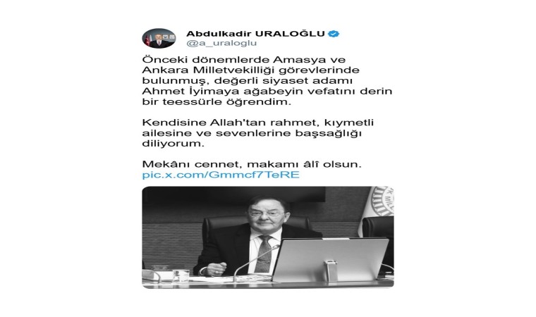 Ulaştırma ve Altyapı Bakanı Abdulkadir Uraloğlu, “Önceki dönemlerde Amasya ve Ankara Milletvekilliği görevlerinde bulunmuş, değerli siyaset adamı Ahmet İyimaya ağabeyin vefatını derin bir teessürle öğrendim. Kendisine Allah’tan rahmet, kıymetli ailesine ve sevenlerine başsağlığı diliyorum. Mekanı cennet, makamı ali olsun” dedi.