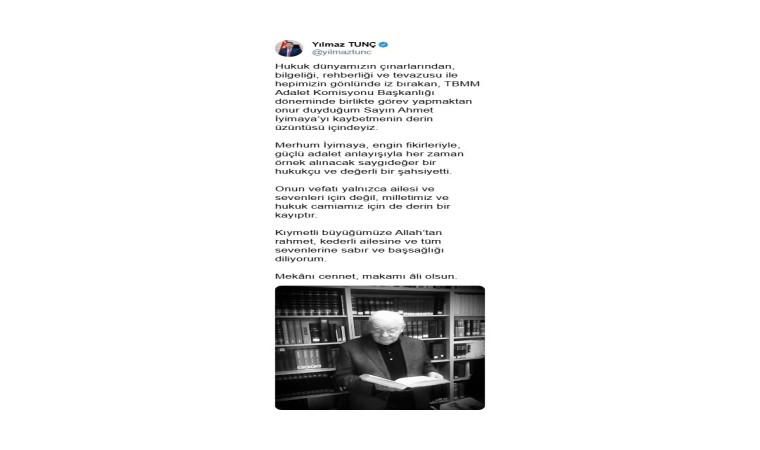 Adalet Bakanı Yılmaz Tunç’un yaptığı paylaşımda ise “Hukuk dünyamızın çınarlarından, bilgeliği, rehberliği ve tevazusu ile hepimizin gönlünde iz bırakan, TBMM Adalet Komisyonu Başkanlığı döneminde birlikte görev yapmaktan onur duyduğum Sayın Ahmet İyimaya’yı kaybetmenin derin üzüntüsü içindeyiz. Merhum İyimaya, engin fikirleriyle, güçlü adalet anlayışıyla her zaman örnek alınacak saygıdeğer bir hukukçu ve değerli bir şahsiyetti. Onun vefatı yalnızca ailesi ve sevenleri için değil, milletimiz ve hukuk camiamız için de derin bir kayıptır. Kıymetli büyüğümüze Allah’tan rahmet, kederli ailesine ve tüm sevenlerine sabır ve başsağlığı diliyorum. Mekanı cennet, makamı ali olsun” denildi.