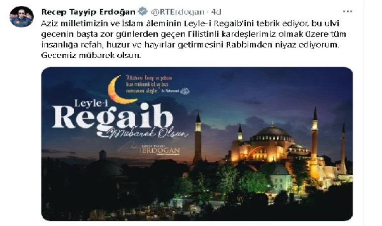 Taha AYHAN/ ANKARA, (DHA)- CUMHURBAŞKANI Recep Tayyip Erdoğan, Regaip Kandili dolayısıyla mesaj yayınladı.
