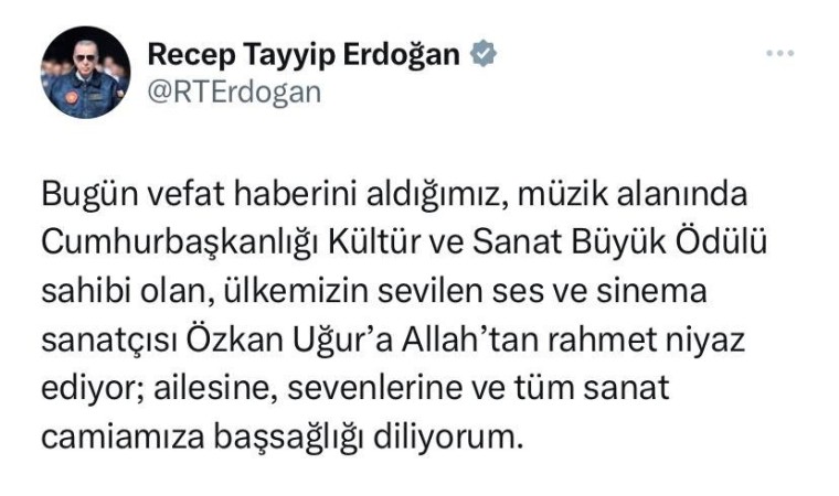 Cumhurbaşkanı Recep Tayyip Erdoğan, hayatını kaybeden değerli sanatçı Özkan Uğur için yayımladığı başsağlığı mesajında duygusal ifadelere yer verdi. Erdoğan'ın mesajında, "Ülkemizin sevilen ses ve sinema sanatçısı Özkan Uğur’a Allah’tan rahmet niyaz ediyor; ailesine, sevenlerine ve tüm sanat camiamıza başsağlığı diliyorum" ifadeleriyle Uğur'a olan saygı ve rahmet dileklerini iletti. Sanat camiasının önemli isimlerinden biri olan Özkan Uğur'un vefatı büyük bir üzüntüye neden oldu.