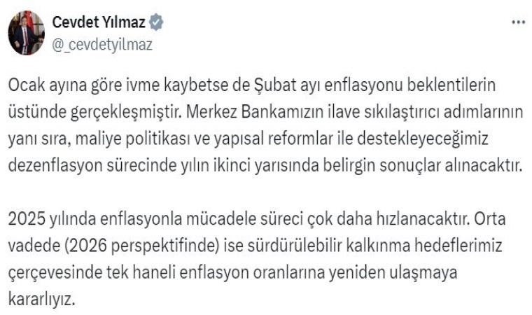 Cumhurbaşkanı Yardımcısı Cevdet Yılmaz, Hazine ve Maliye Bakanı Mehmet Şimşek’in paylaşımını alıntılayarak yaptığı paylaşımda, “Ocak ayına göre ivme kaybetse de şubat ayı enflasyonu beklentilerin üstünde gerçekleşmiştir. Merkez Bankamızın ilave sıkılaştırıcı adımlarının yanı sıra, maliye politikası ve yapısal reformlar ile destekleyeceğimiz dezenflasyon sürecinde yılın ikinci yarısında belirgin sonuçlar alınacaktır. 2025 yılında enflasyonla mücadele süreci çok daha hızlanacaktır. Orta vadede (2026 perspektifinde) ise sürdürülebilir kalkınma hedeflerimiz çerçevesinde tek haneli enflasyon oranlarına yeniden ulaşmaya kararlıyız” ifadelerini kullandı.