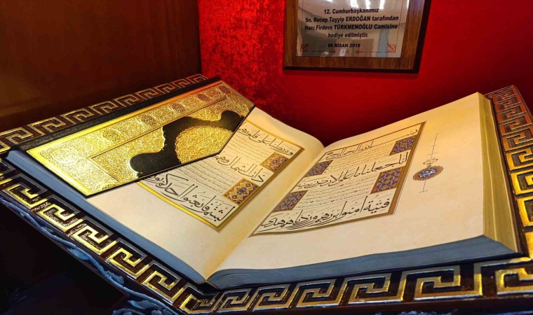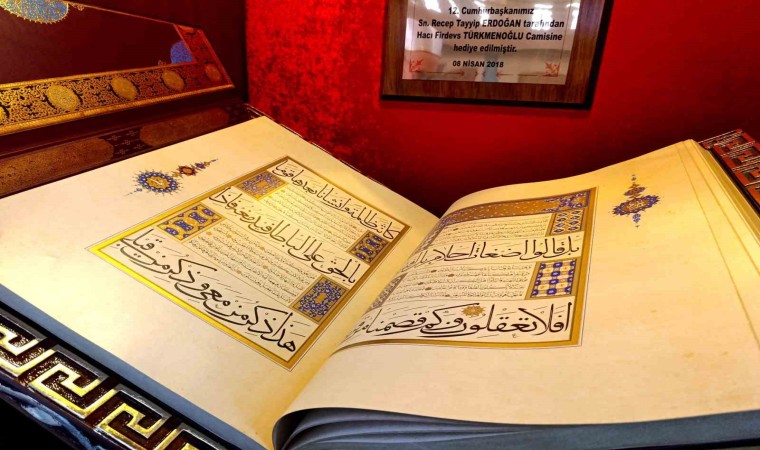 Cumhurbaşkanı Recep Tayyip Erdoğan tarafından bizzat hediye edilen Hattat Ahmed Karahisari eserlerinden olan 428 yıllık Kur’an-ı Kerim replikası, sergilendiği Hacı Firdevs Türkmenoğlu Camii’nde yoğun ilgi görüyor.