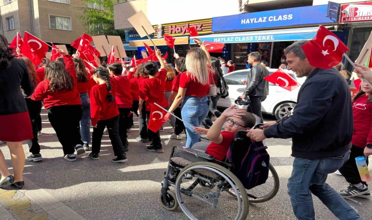 Ülke genelinde olduğu gibi Eskişehir’de de Cumhuriyet’in 100. yılı coşkuyla kutlanıyor. Tepebaşı ilçesinde bulunan Namık Kemal Ortaokulu öğrencileri yürüyüş yaparak Cumhuriyet’in 100. yılını kutladı. Bahçelievler Mahallesi Seylap Caddesi’nde yürüyen okul öğrencilerinin arasında arkadaşlarına tekerlekli sandalyesi ile eşlik eden Recep İnan, bayramın coşkusunu doyasıya yaşadı. Doğuştan yürüme yetisi olmayan İnan, babasının yardımıyla kortejde arkadaşlarıyla birlikte Türk bayrağı sallayıp marş söyledi.