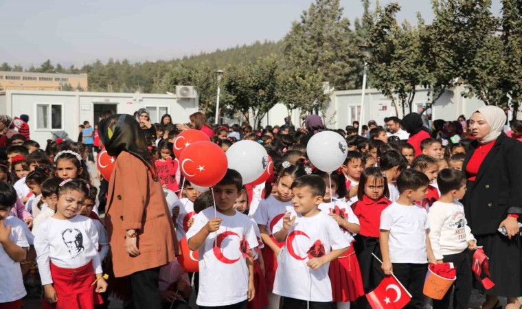 Kahramanmaraş Karacasu Konteyner Kent’te eğitim gören ilkokul öğrencileri, konteyner sınıflarının önünde Cumhuriyet’in ilanının 100. yılını düzenledikleri etkinlikle kutladı.