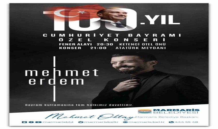 Marmaris Belediyesi, Cumhuriyet’in 100. yıl dönümü dolayısıyla coşku dolu bir program hazırladı. ‘Cumhuriyet coşkusu Cumhuriyet’in kalesi Marmaris’te yaşanır’ sloganıyla düzenlenecek etkinliklerde ünlü pop müzik sanatçısı Mehmet Erdem sahne alacak.