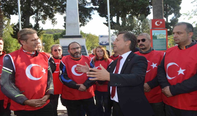 Görkemli şehir turunun ardından Ayvalık Öğretmenevi önündeki İlk Kurşun Anıtı önüne gelen motosikletliler burada saygı duruşu ve İstiklal Marşı’nı birlikte seslendirdi.