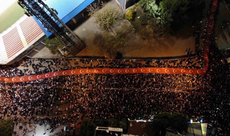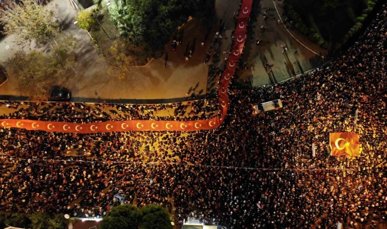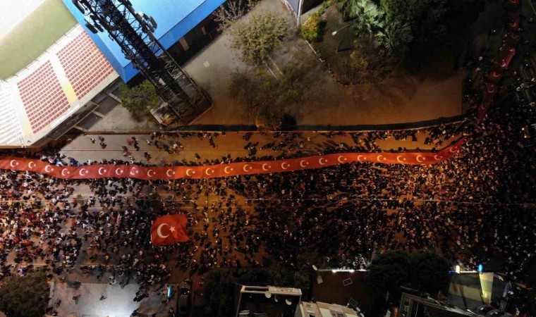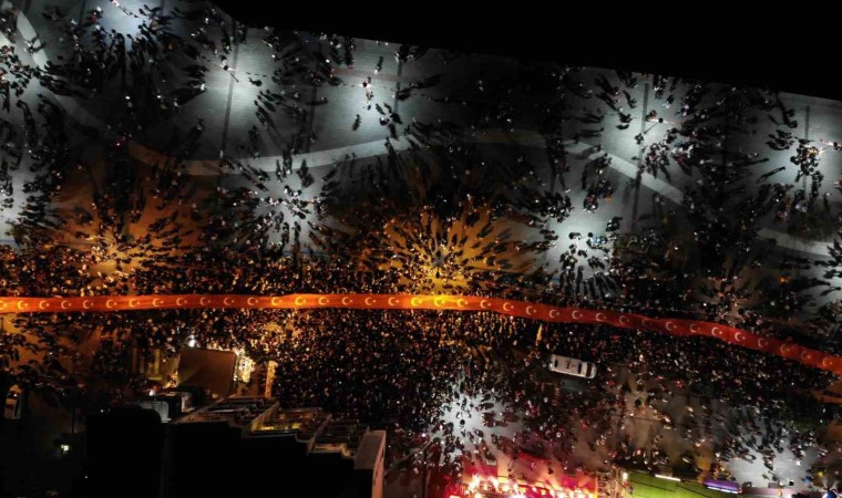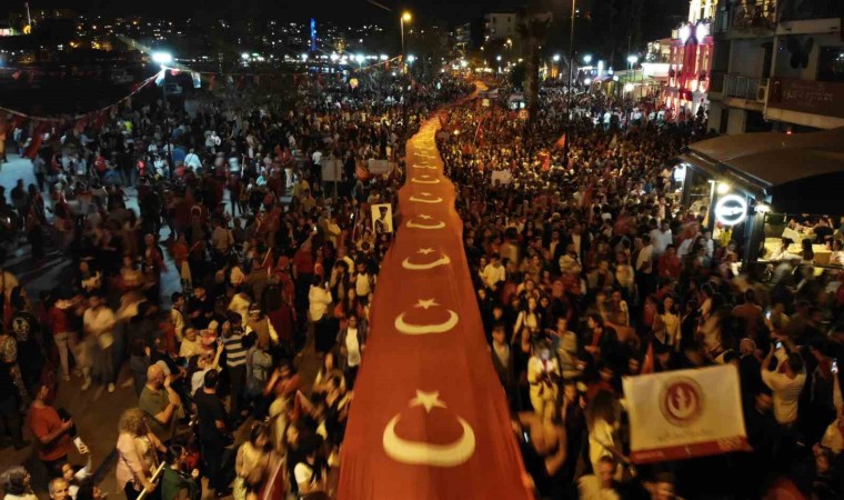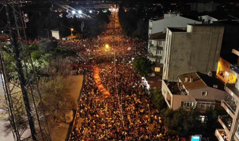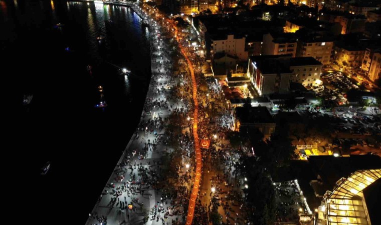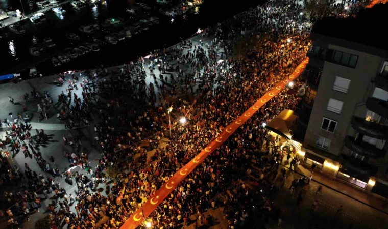 Çanakkale’de Cumhuriyet’in 100. yılında Valilik tarafından düzenlenen fener alayına on binlerce vatandaş katıldı. Valilik koordinesinde Cumhuriyet’in 100. yılına özel olarak 2023 metre uzunluğunda Türk bayrağı hazırlandı. Fener alayında vatandaşlar, 2023 metre uzunluğundaki Türk bayrağıyla yürüdü. Yürüyüş sırasında vatandaşlar ‘Mustafa Kemal’in Askerleriyiz’, ‘Ne Mutlu Türküm Diyene’ sloganları atıp, ‘Andımız ve İzmir Marşları’nı söyledi.