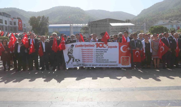 29 Ekim Cumhuriyet Bayramı’nın 100. yıl dönümü Fethiye Beşkaza Meydanı’nda yapılan coşkulu törenle de kutlandı. Çelenk töreni, Türk Hava Kurumu paramotor gösterileriyle başladı. Fethiye Kaymakamlığı ve Fethiye Belediye Başkanlığı çelenklerinin sunumu, saygı duruşu ve istiklal marşı okunmasıyla ile devam eden tören öğrencilerin ‘Cumhuriyet’ konulu şiirlerini okumasının ardından sona erdi.