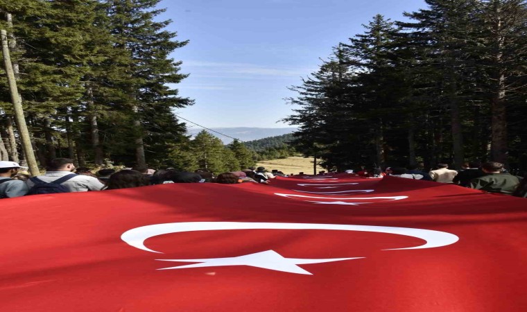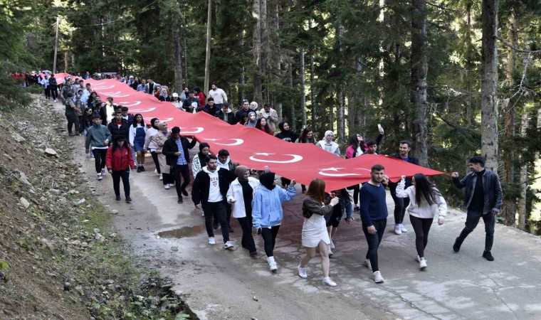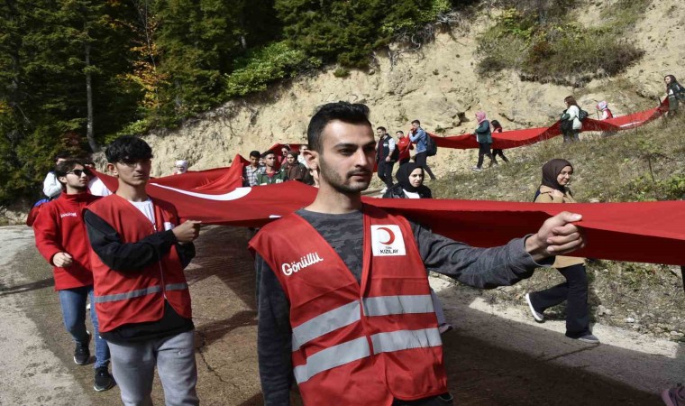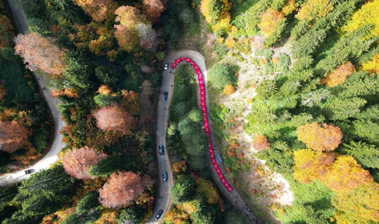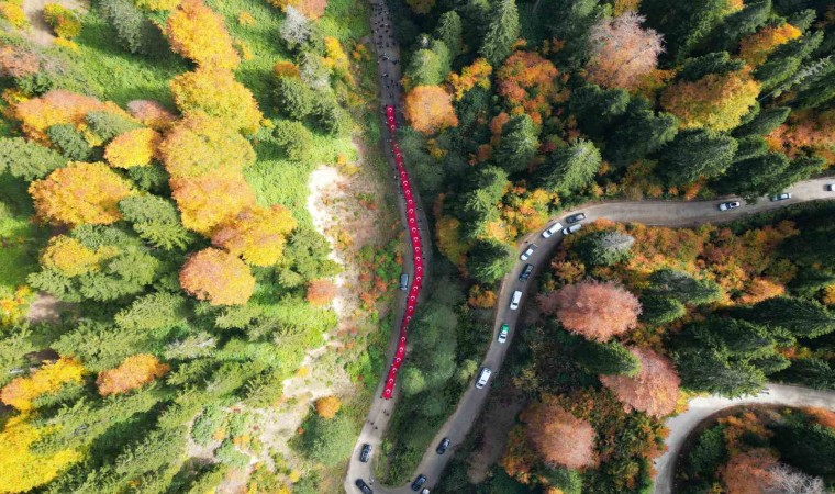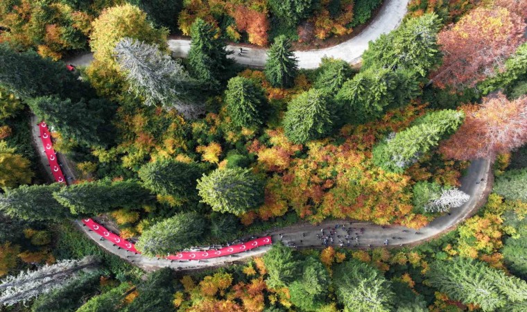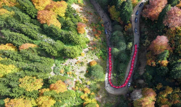 Gümüşhane’de Cumhuriyetin 100. yılı kutlamaları kapsamında Vali Alper Tanrısever’in de katılımıyla 300’ü aşkın genç sonbaharın büyülü renklerine bezenen Örümcek Ormanları’nda 100 metrelik Türk Bayrağını 7,5 kilometre taşıyarak yürüdü.