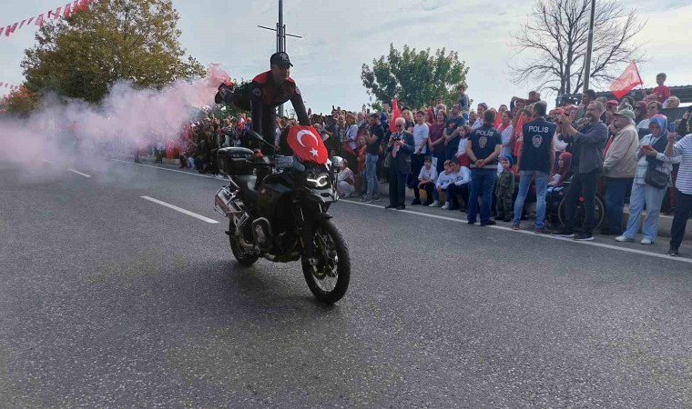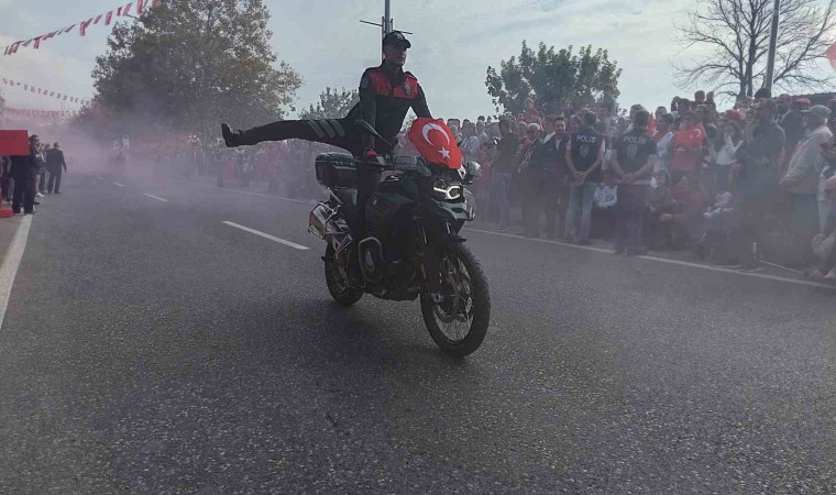Türkiye Cumhuriyeti’nin 100. yılı tüm yurtta çeşitli etkinliklere kutlanmaya devam ediliyor. Tekirdağ’da da valilik tarafından koordine edilen programda sahil yolu trafiğe kapatıldı. Vatandaşlar sahil yolunu doldururken, alanda jandarma ve yunus timleri tarafından çeşitli gösteriler düzenlendi. Jandarma komandolar yeri göğü inleterek silahlı gösteri yaptı. Hemen ardından Tekirdağ İl Emniyet Müdürlüğüne bağlı motorize yunus ekipleri sahneye çıktı. Motorize ekipler, motosikletlerin üzerinde akrobatik hareketeler yaparak vatandaşlara muhteşem bir görsel şölen sundu. Jandarma köpeğinin eğitmeni ile gösterileri de vatandaşlar tarafından alkış topladı.