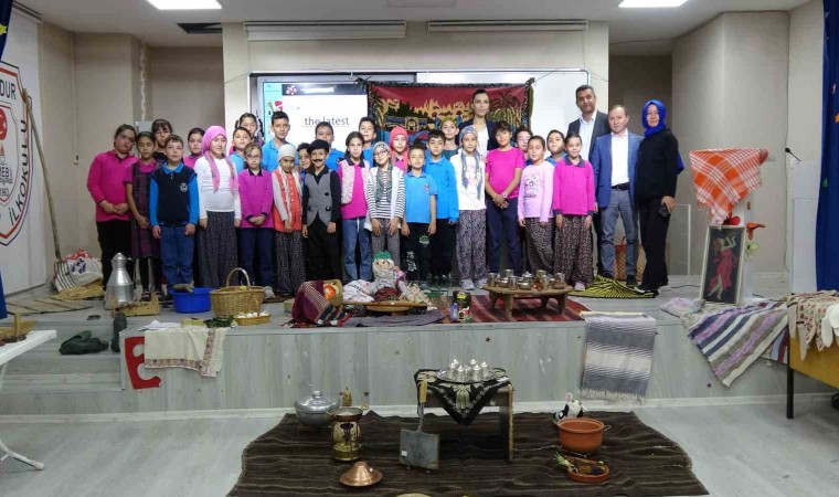 Burdur’da Cumhuriyet’in 100’üncü yılı nedeniyle ilkokul öğrencilerine öğretmen ve veliler tarafından tarihi aşılamak amacıyla yöresel ürünlerin tanıtıldığı sergi açıldı.