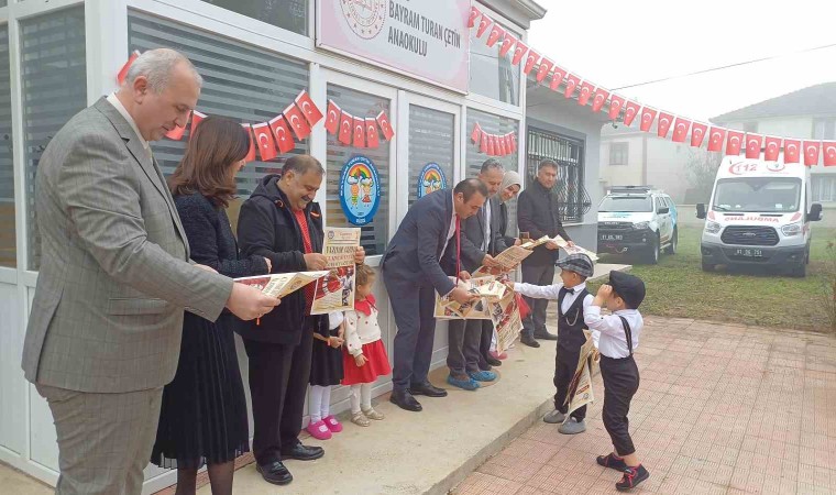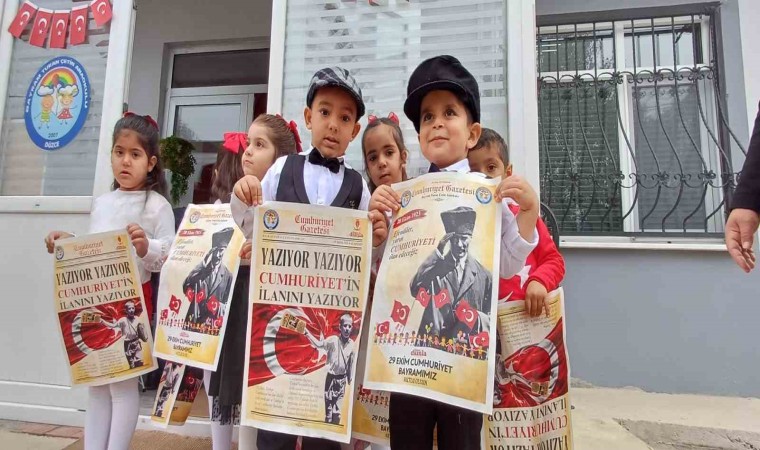 Düzce(İHA) – Anaokulu öğrenciler Cumhuriyetin ilan edildiği 1923 yılını özel hazırlanan gazeteleri dağıtarak yeniden hatırlattı. Dönem kıyafetleri giyerek Cumhuriyetin ilan edildiği haberini okula ziyarete gelen müdürlere ileten minikler, ilgi odağı oldu.