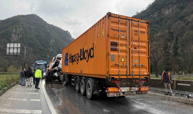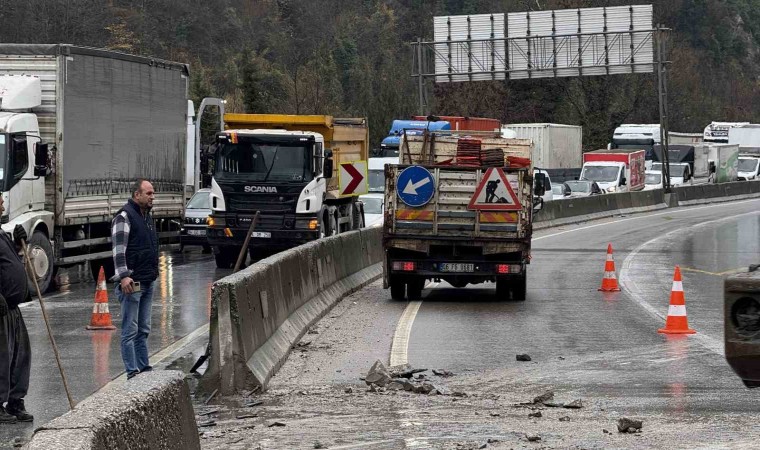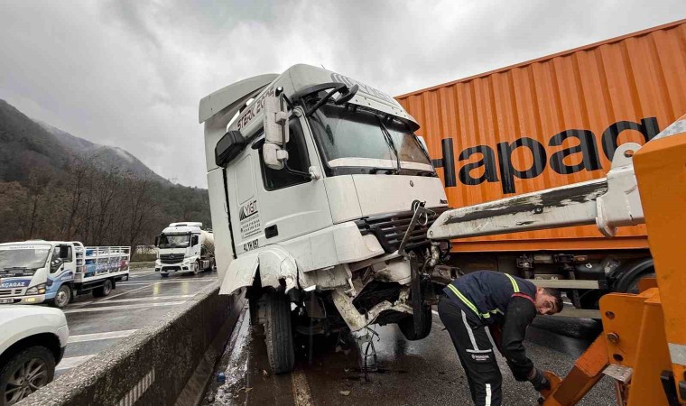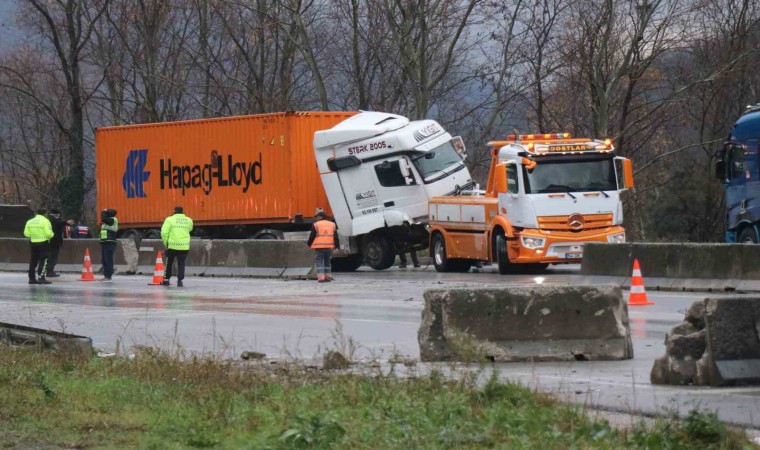Karayolunun Şerefiye Mahallesi Adapazarı istikametinde meydana gelen kazada, sürücüsünün ismi öğrenilemeyen 41 YH 097 çekici plakalı Mercedes marka tırın makaslayarak beton bariyerlere çarptı. Makaslayan tıra çarpmamak için duran 06 CZE 064 plakalı tıra ise aynı istikamette bulunan otomobil çarptı. Meydana gelen zincirleme kazada yola savrulan beton bariyer parçaları her iki istikamette de trafiğin durmasına sebep oldu. Durumun haber verilmesi üzerine bölgeye polis ve jandarma ekipleri sevk edildi. Yaralananın olmadığı kazada D-650 kara yolunun her iki istikametinde de kilometrelerce araç kuyruğu oluştu. Araçların ve bariyerlerin kaldırılması sonrasından trafik normal seyrine dönerken olay yeri ve oluşan trafik havadan görüntülendi.