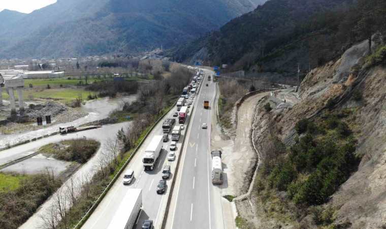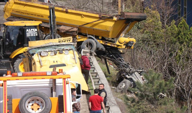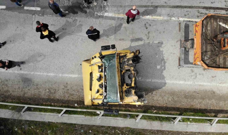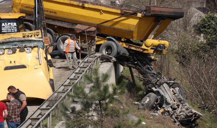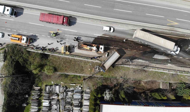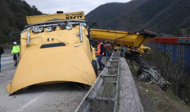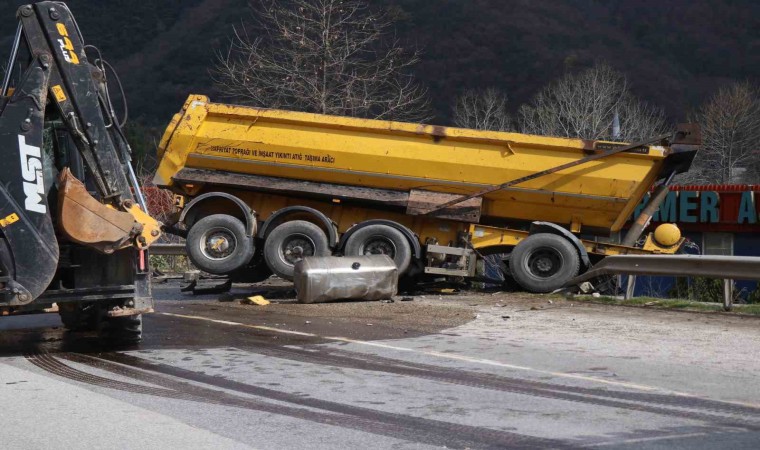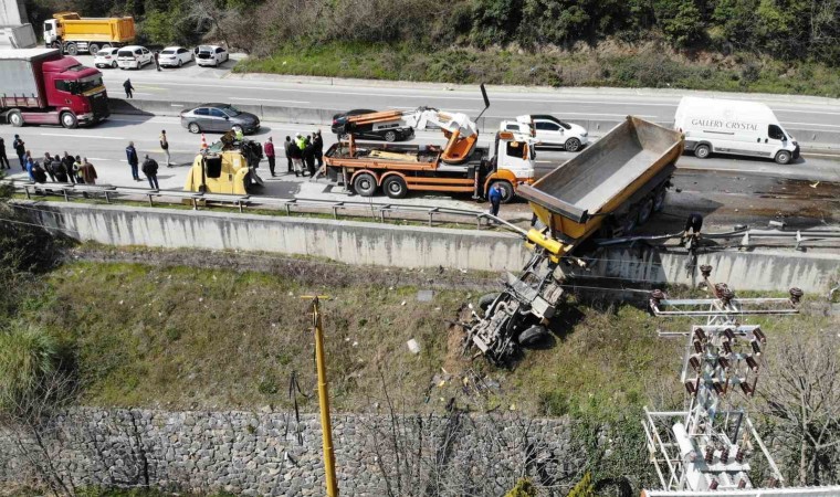 Sakarya’nın Geyve ilçesi D-650 kara yolunda kontrolden çıkarak karşı şeride geçen hafriyat tırı bariyerlere çarptı. Kupası kopan ve dorsesi bariyerlere asılı kalan tırın sürücüsü kazada yaralandı. Kilometrelerce araç kuyruğunun oluştuğu bölge dronla havadan da görüntülendi.