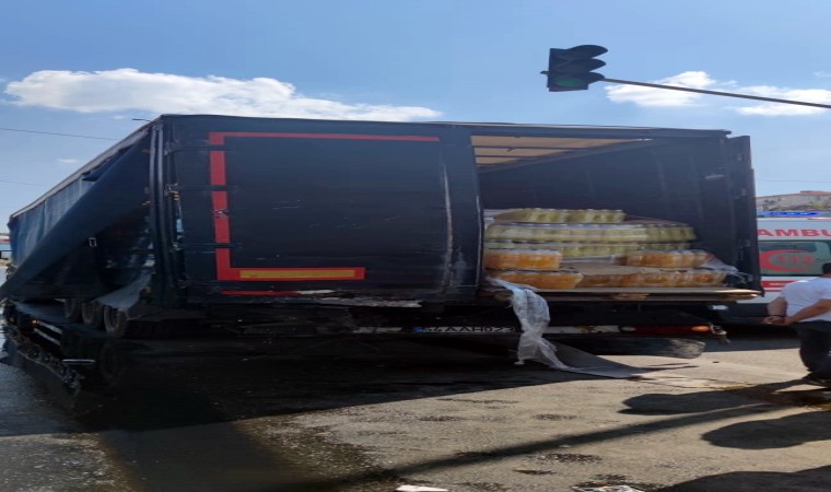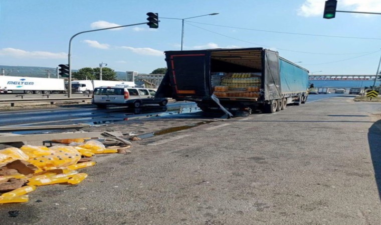 Sakarya’nın Pamukova ilçesi D-650 Karayolu’nda trafik ışıklarında duran içecek yükle tıra arkasından gelen farklı bir tır çarptı. Araçlarda maddi hasarın meydana geldiği ve içeceklerin yola savrulduğu kaza anı güvenlik kamerasına yansıdı.