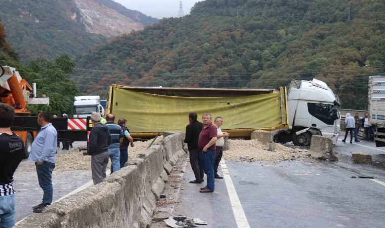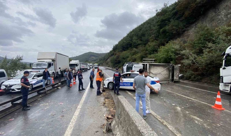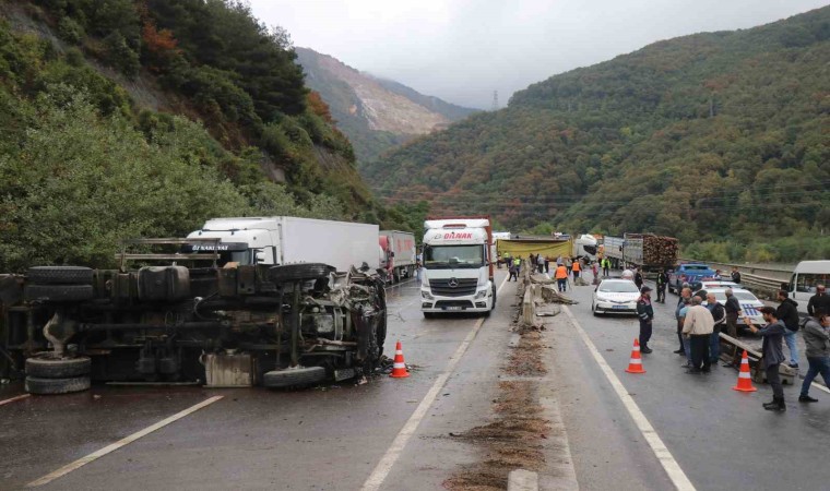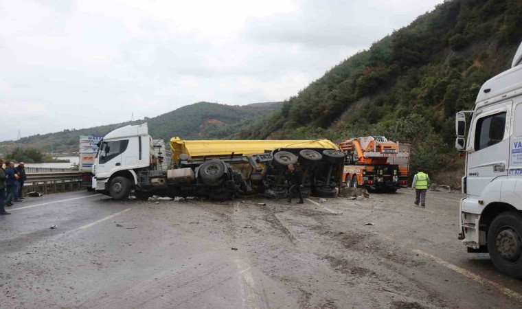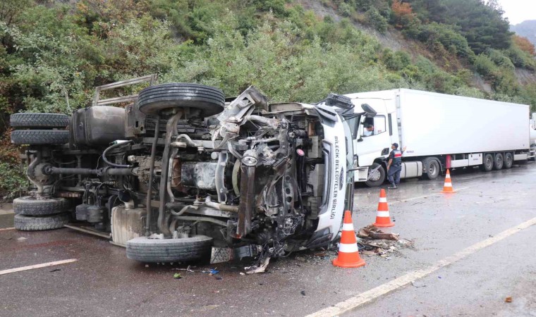 D-650 kara yolu Kızılkaya Mahallesi mevkiinde meydana gelen kazada, Bilecik istikametine seyir halinde olan Bilecik Belediyesi’ne ait çöp kamyonu yapış sebebiyle kontrolden çıkarak devrildi. Kazayı gören 34 GBV 001 plakalı hafriyat tırı ani fren yapması neticesinde kontrolden çıkarak karşı şeride geçip yan yattı. Aynı istikamette seyir halinde olan ve kazayı gören 03 HS 078 plakalı kamyon ise manevra yaparak karşı yönden gelen 55 AFB 136 plakalı tır ile kafa kafaya çarpıştı. Meydana gelen zincirleme trafik kazasında Bilecik Belediyesi’ne ait çöp kamyonundaki sürücü yaralandı. Durumum haber verilmesi üzerine bölgeye sağlık, jandarma, polis ve itfaiye ekibi sevk edildi. Olay yerine gelen sağlık ekipleri yaptıkları ilk müdahale sonrasında yaralıyı hastaneye sevk etti. Meydana gelen kaza neticesinde D-650 kara yolunun her iki istikameti trafiğe kapandı. Kaza sebebiyle kara yolunun her iki istikametinde de kilometrelerce araç kuyruğu oluştu. Ekipler, kazaya karışan araçları bulunduğu yerden kaldırmak için çalışmalarını sürdürürken kazaya ilişkin inceleme başlatıldı.