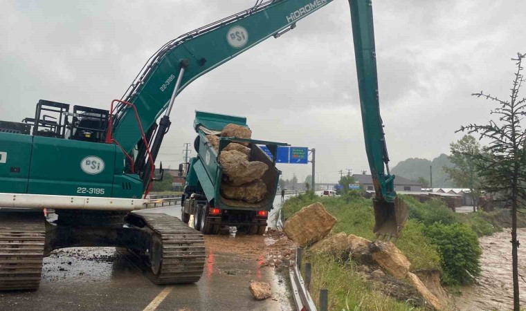 DÜZCE (İHA) - Düzce'de yaşanan sağanak yağışlar, Asar Deresi'nde heyelana neden oldu. Heyelanın etkisiyle, yol üzerinde çalışma yapılması gerekti ve bu nedenle D100 karayolu Ankara istikameti trafiğe kapatıldı.