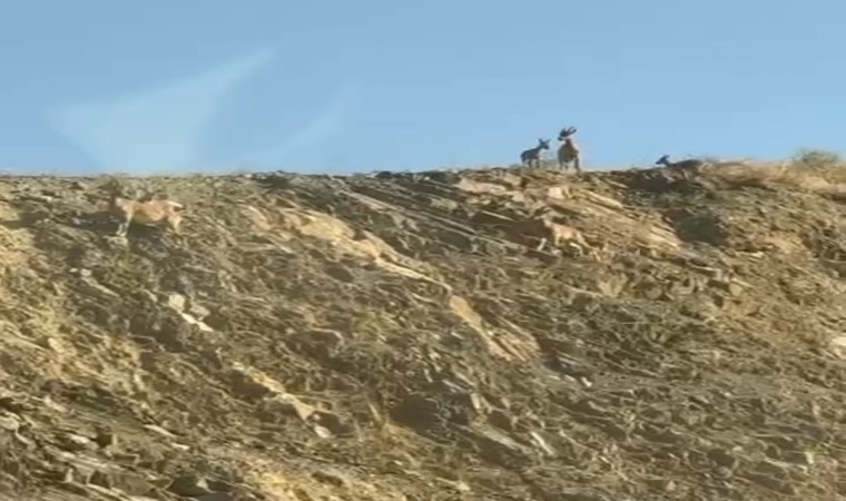 Hakkari’de sıcakların artmasıyla birlikte yiyecek bulmakta zorlanan koruma altındaki dağ keçileri, yerleşim yerlerine kadar inmeye başladı. 3 bin 487 rakımlı Sümbül Dağı eteklerinde yaşayan dağ keçilerinin, Sümbül Mahallesi’ne kadar inmesi mahalle sakinlerini de şaşırttı. Sürü halinde hareket eden dağ keçileri, yoldan geçen sürücüler tarafından cep telefonu kamerasıyla görüntülendi. Görüntülerde, dağ keçilerinin yavruları ile dolaşması ve oynaması sonrasında dağın zirvelerine doğru hareket ederek gözden kayboldukları görülüyor.