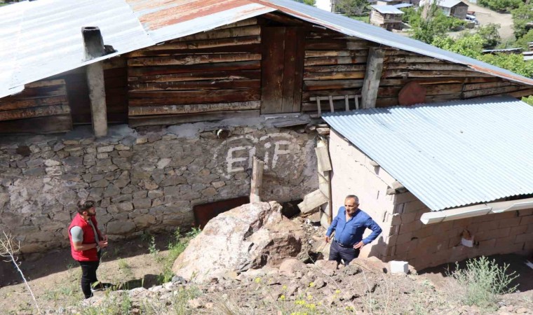 Erzurum’un Oltu ilçesi Gökçedere Mahallesi’nde sağanak yağmur sonrası dağdan kopan dev kaya parçası mahalle sakinlerini mağdur etti.