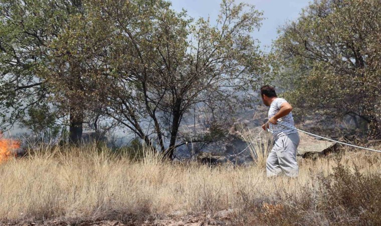 Vatandaşların da söndürme çalışmalarına katıldığı yangının büyüklüğü, dron ile görüntülendi.