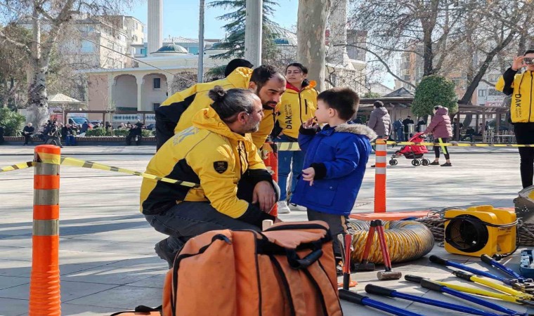 Dağ Arama Kurtarma Derneği (DAK), Kahramanmaraş depreminin 1. yıldönümü dolayısıyla Denizli 15 Temmuz Delikliçınar Şehitler Meydanında açtığı stantta arama kurtarma ekipmanlarını ve depremde yaptıkları çalışmaları anlattı.