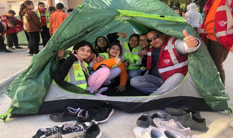 Çocuklar teorik eğitimin ardından çadır kurmanın tekniklerini öğrendi.