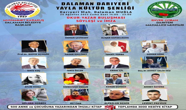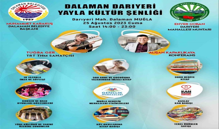 Diğer şenlik ve festivallerden farklı olarak “kitap ve kültür” temalı içeriğiyle öne çıkan Dalaman-Darıyeri Yayla Kültür Şenliği için bütün hazırlıklar tamamlandı. Şenlik kapsamında; 18 yazar kitaplarını imzalayacak, okurlarıyla söyleşi yapacak. Şenliğe ilk gelen 500 anne ve çocuğuna yazarından imzalı kitap hediye edilecek. Misafirlere toplamda 3 bin hediye kitap dağıtılacak.