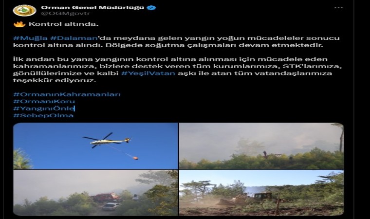 Dalaman’da 17 Ekim Perşembe günü gece saatlerinde başlayan orman yangını yoğun mücadeleler sonucu kontrol altına alındı. Orman Genel Müdürlüğü’nden yapılan paylaşımda, "Muğla Dalaman’da meydana gelen yangın yoğun mücadeleler sonucu kontrol altına alındı. Bölgede soğutma çalışmaları devam etmektedir. İlk andan bu yana yangının kontrol altına alınması için mücadele eden kahramanlarımıza, bizlere destek veren tüm kurumlarımıza, STK’larımıza, gönüllülerimize ve kalbi yeşil vatan aşkı ile atan tüm vatandaşlarımıza teşekkür ediyoruz" ifadelerine yer verildi.