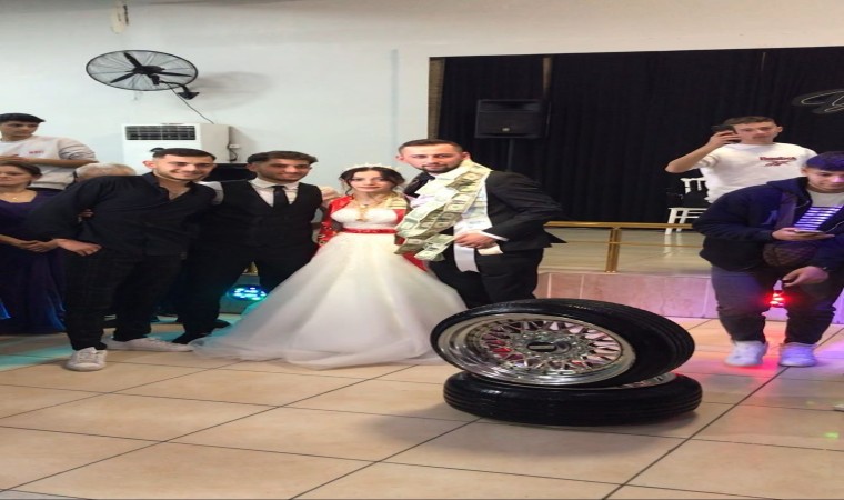 Zonguldak’ın Alaplı ilçesinde yaşayan Esin ve Cem Ünal çifti, hafta sonu ilçedeki bir düğün salonunda dünyaevine girdi. Düğünde takı merasimine geçildiğinde davetliler gelin ve damada takılarını takmaya başladı. İlçede esnaflık yapan 18 yaşındaki Yiğitcan Demirer ise, 35 bin lira değerindeki iki adet jant ve lastikle düğün salonuna girdi. Davetlilerin şaşkın bakışları arasında gelin ve damadın yanına gelen Demirer, jant ve lastiği salonun ortasına bırakarak hediye etti.