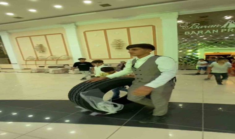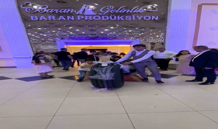 Mardin’in Nusaybin ilçesinde Kahraman Tuna ve Çiğdem Tuna’nın düğününde, damada altın yerine araç lastiği hediye edildi.