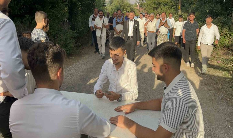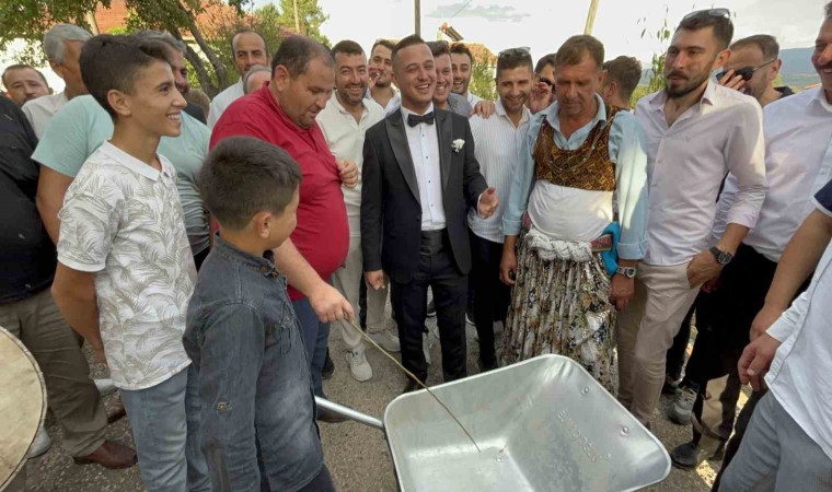 Bolu’da düğün öncesinde davullarla köyde yürüyen damadın önünü, 10 yaşındaki bir çocuk el arabasıyla kesti. Küçük çocuk, damadın el arabasını parayla doldurmasını istedi.