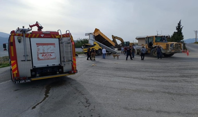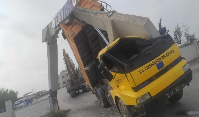 Hatay’ın İskenderun ilçesinde damperi açık olan bir kamyon çöplük alanına girerken, giriş kapısı üzerindeki beton, damperin çarpması sonucu kamyonun üzerine düştü. Betonun düşmesi sonucu 2 kişi yaralandı.