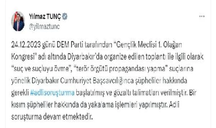 Bakan Tunç, sosyal medya hesabından yaptığı açıklamada, "24 Aralık 2023 günü DEM Parti tarafından 'Gençlik Meclisi 1'inci Olağan Kongresi' adı altında Diyarbakır'da organize edilen toplantı ile ilgili olarak 'suç ve suçluyu övme', 'terör örgütü propagandası yapma' suçlarına yönelik Diyarbakır Cumhuriyet Başsavcılığınca şüpheliler hakkında gerekli adli soruşturma başlatılmış ve gözaltı talimatları verilmiştir. Bir kısım şüpheliler hakkında da yakalama işlemleri yapılmıştır. Adli soruşturma devam etmektedir" dedi. (DHA)