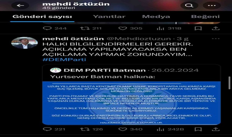 Batman’da 25 Şubat’ta Batman Petrolspor ile Anadolu Üniversitesi arasında oynanan futbol müsabakasında maçı taraftarlar arasında HÜDA PAR Batman Belediye Başkan Adayı Serkan Ramanlı ile birlikte izlediği sırada yan yana fotoğrafı çıkan DEM Adayı Mehdi Öztüzün ile ilgili parti içerisinde çıkan rahatsızlığın ardından partiden yapılan açıklamada, konunun partinin ilgili kurullarınca incelenmekte olduğunu duyurmuştu. Açıklamada, "Dün bir futbol karşılaşmasında yaşanan durum, halkımızda ve değerli ailelerimizde büyük bir tepkiye ve infiale neden olmuştur. Öncelikle tüm halkımızı ve değer ailelerimizi yaşananlar karşısında sükunete çağırıyoruz. Söz konusu durum, partimizin ilgili kurullarınca incelenmekte olup, geniş değerlendirme daha sonra yapılacaktır" denilmişti.
