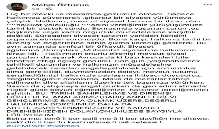 Açıklamada, “Yurtsever halkımız ve demokratik kurumlarımızın olağanüstü çağrısı üzerine yapılan de şu karara varmıştır; Halkımız ve partimiz açısından önemli bir seçim sürecinin içindeyiz. Partimiz bu sürece hazırlanırken 31 Mart Yerel Seçimlerinde Belediye Eşbaşkan adaylarımızın halk oylamasıyla seçileceğini kamuoyuna açıklamış ve adaylarımız büyük bir şeffaflıkla halk tarafından belirlenmiştir. Gelinen aşamada partimize, yurtseverlik kültürümüze ve kadın iradesine karşı tutumu nedeniyle Mehdi Öztüzün ile partimiz ve kurumlarımız ile herhangi bir bağı ve ilişkisi kalmamıştır. Öztüzün’ün belediye eşbaşkan adayımız olmadığını kamuoyuna duyuruyoruz" ifadelerine yer verildi.
