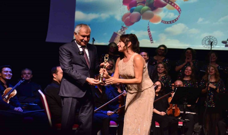 Başkan Karalar, Demet Akbağ’a onur ödülünü verirken Uğur Polat’a ise Mehmet Aslantuğ ödülünü takdim etti.